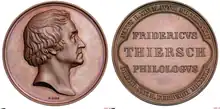 Thiersch died in Munich. He is buried in the Alter Südfriedhof in Munich. After his death the Bayerische Akademie der Wissenschaften commissioned a bronze medal made by the engraver Joahnn Adam Ries in 1860.[3][4] His biography was written by his son, H. W. J. Thiersch (1866).[1] Another son, Karl Thiersch, was a renowned surgeon, and yet another, Ludwig Thiersch, was an influential painter.
