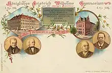 The Friedrich Wilhelm Gymnasium buildings were located on Kochstrasse in Berlin's Friedrichstadt district.[1] The grammar school was located on Kochstrasse at the corner of Friedrichstrasse 41 until 1890 (demolished) when it was relocated to a new building at Kochstrasse 13 (south side),[2] built according to plans by building officer Friedrich Schulze from 1888 to 1890. The Realgymnasium and Elisabeth School were located at Kochstrasse 66 and 65 (north side), respectively.