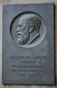 Friedrich Freiherr von Wieser[1] (German: [ˈviːzɐ]; 10 July 1851 – 22 July 1926) was an early (so-called "first generation") economist of the Austrian School of economics. Born in Vienna, the son of Privy Councillor Leopold von Wieser, a high official in the war ministry, he first trained in sociology and law. In 1872, the year he took his degree, he encountered Austrian-school founder Carl Menger's Grundsätze and switched his interest to economic theory.[2] Wieser held posts at the universities of Vienna and Prague until succeeding Menger in Vienna in 1903, where along with his brother-in-law Eugen von Böhm-Bawerk he shaped the next generation of Austrian economists including Ludwig von Mises, Friedrich Hayek and Joseph Schumpeter in the late 1890s and early 20th century. He was the Austrian Minister of Commerce from August 30, 1917, to November 11, 1918.