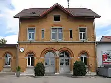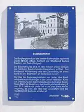 Friedrichshafen Stadt station was dedicated on 8 November 1847 as the first station on Lake Constance with the opening of the first section of the Württemberg Southern Railway from Ravensburg to Friedrichshafen. This meant that the Kingdom of Württemberg had achieved its goal of completing the first railway to Lake Constance ahead of Bavaria and Baden. The station building was built between 1846 and 1848 by the architect Ludwig Friedrich von Gaab. On 26 May 1849, the Southern Railway was extended to Biberach an der Riss and on 1 June 1850 to Ulm. With the completion of Fils Valley Railway from Ulm to Stuttgart on 29 June 1850, Friedrichshafen and the Southern Railway were connected to the rest of the Württemberg railway network, allowing a continuous service from Heilbronn to Friedrichshafen. On 1 October 1899, the first piece of the Bodenseegürtel Railway (Lake Constance Belt Railway) was opened from Lindau to Friedrichshafen Stadt and opened and on 2 October 1901 the line was continued from Friedrichshafen to Überlingen, which had been connected since 1895 to Singen via Radolfzell. Two wings were added to the station building for the Bodenseegürtel Railway, which connected Bavaria, Württemberg and Baden. The Southern Railway was duplicated from 1905 to 1913. On 2 June 1922, the Württembergische Nebenbahnen AG (Württemberg Secondary Railways Company) commenced operations on the Teuringen Valley Railway (Teuringertal-Bahn) to Oberteuringen. Already in May 1923 it had to close its operations for financial reasons, before they could be restarted in 1924 by the Teuringertal-Bahn GmbH. In the Second World War the west wing was destroyed in an air raid on 20 July 1944; it was rebuilt after the war in its original form.[3] Passenger services on the Teuringen Valley Railway were closed on 23 May 1954 and freight traffic ended on 15 February 1960. The section from Friedrichshafen Stadt to the former Friedrichshafen-Zahnradfabrik station continues to operate as a siding.