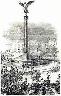The Gendarmenmarkt, Friedrichstadt's main plaza, experienced many changes toward the end of the 18th century. Between 1774 and 1776, a small French theater house was built, which was later christened the Nationaltheater as the establishment came to the forefront in German theater. Also, between 1780 and 1785, the French and German churches on the plaza built distinctive cupolaed towers on top of their churches, leading to the two being known as the Deutscher Dom and the Französischer Dom (English: German and French Cathedrals, respectively) to the present day. In 1800, the Nationaltheater was replaced with a larger theater, the Schauspielhaus (English: Play House), whose architecture had to be designed to compete with the new cupola towers on the Gendarmenmarkt's twin churches. However, public reaction to the new theater's design was negative, and many people called the Carl Gotthard Langhans-designed building the "Koffer" (English: Trunk or suitcase). Luckily for dissatisfied Berliners, the Schauspielhaus burnt to the ground in 1817 and a new theater, designed by Karl Friedrich Schinkel, was built in its place. In 1843, after 25 years of peace in Prussia, a monument to this achievement, the Friedenssäule (English: Peace Column) was built in the then Belle-Alliance-Platz.
