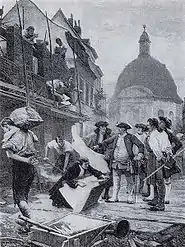 Friedrichstadt was severely damaged in the widespread destruction which accompanied World War II, especially in the first area bombardment organised and carried out by the United States Air Force on the morning of February 3, 1945. The bombs consisted mostly of inflammables, hardly explosives. The bombing was so dense that it caused a city fire spreading eastwards, driven by the wind, over the centre and south of Friedrichstadt and the northwest of neighboured Luisenstadt. The fire lasted for four days until it had burnt everything combustible in its range to ashes and after it had reached waterways, and large thoroughfares, parks and the like over which the fire could not jump any further.[3] Many of the historic buildings in the neighbourhood were so badly damaged that they had to be condemned or torn down. The construction of the Berlin Wall directly through the neighbourhood brought only more destruction. In the northern portion of the neighbourhood, which lay within the boundaries of Mitte Borough, which was part of East Berlin, systematic rebuilding began in 1970. Along Leipzig Street, which had been almost completely flattened, high-rise apartment buildings were constructed. In the southern half of Friedrichstadt, which was located in the West Berlin borough of Kreuzberg, a more historically accurate reconstruction of the neighbourhood occurred. The neighbourhood was reconstructed, block by block, according to the original street plan, in a historically accurate manner.
