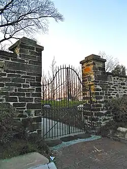 Friends Burial Ground is a historic Quaker cemetery in Baltimore, Maryland, United States. It is the earliest cemetery in Baltimore, established in 1713, and 2.8 acres (11,000 m2) in size. It contains a total of approximately 1,900 small, simple grave markers, arranged in compact rows interspersed with large trees. The graveyard is surrounded by a fieldstone wall 8 feet (2.4 m) high, built in the 1860s, now covered with moss, roses, and ivy.[2]