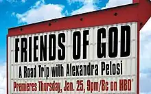 Friends of God: A Road Trip With Alexandra Pelosi is an HBO television documentary about evangelicals in the United States that is written, directed, produced, and narrated by Alexandra Pelosi.[1] The documentary first aired on January 25, 2007 on HBO.[2] Lisa Heller was supervising producer and Sheila Nevins was executive producer.[1]