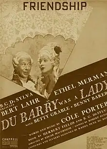 Cole Porter wrote "Friendship" for the finale to his 1939 musical DuBarry Was a Lady which opened on Broadway at the 46th Street Theatre on December 6, 1939.[1] It was premiered by Ethel Merman as Mme. La Comtesse du Barry and Bert Lahr as The King of France. In subsequent productions, Frances Day and Arthur Riscoe performed the song in the original 1942 London premiere; and Faith Prince and Robert Morse performed it in the 1996 Encores! revival.[2]