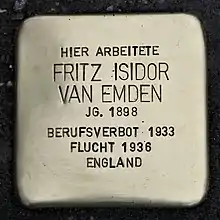 Van Emden became a Carabidae specialist and from 1927 worked at the Staatliches Museum für Tierkunde und Völkerkunde in Dresden,[4] where he was a mentor to Willi Hennig.[6] In 1932 van Emden attended the 5th International Congress of Entomology at Paris as a German representative.[7] Because Van Emden's mother was Jewish, he faced persecution when the Nazis came to power in 1933 and he was barred from Civil Service employment. Van Emden was reported for his Jewish heritage by the Dresden Museum's director, Arnold Jacobi, who let him continue his private research in the Museum library, though unpaid.[4] A plaque in Dresden commemorates van Emden's last German workplace and subsequent flight from Germany.