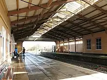 Frome station was designed by J R Hannaford. It is one of the oldest through train shed railway stations still in operation in Britain. The unusual station structure consists of a 120 by 48 foot (36.5 x 14.6 metres) timber train shed, supported by 12 composite trusses with a span of 49 feet (15 m).[1] The station has two platforms, one of which is now unused due to the line being made into a single track.[2] It is now a Grade II listed building.[3]