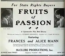 Fruits of Passion is a 1919 American silent drama film directed by George Ridgwell and starring Alice Mann and Donald Hall.[1] Location shooting took place in the Adirondack Mountains.