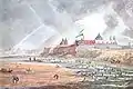 Watercolor depicting El Fuerte and the playa baja, painting by Emeric Essex Vidal (in 1816), note that the Argentine flag was already flying at that time. The territory of the playa baja was filled in at the end of the 19th century and corresponds to the current Puerto Madero.