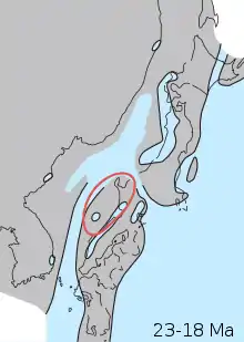 Map showing hypothesized paleodistribution of the genus Fukuia (Fukuia integra, Fukuia kurodai and Fukuia multistriata) in the Early Miocene (23-18 Ma).
