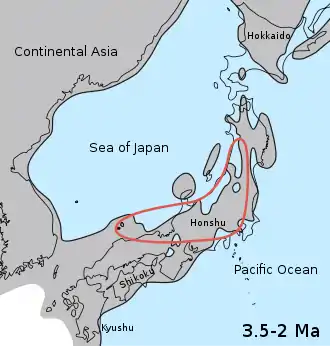 Map showing hypothesized paleodistribution of the genus Fukuia in the Middle Pliocene to Late Pliocene (3.5-2 Ma).