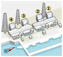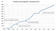 At the time of the earthquake, Unit 4 had been shut down for shroud replacement and refueling since 29 November 2010.[1][2] All 548 fuel assemblies had been transferred in December 2010 from the reactor to the spent fuel pool on an upper floor of the reactor building[3] where they were held in racks containing boron to damp down any nuclear reaction.[4] The pool is used to store rods for some time after removal from the reactor and contains 1,331 rods.[5] Recently active fuel rods produce more decay heat than older ones.[6] At 4 pm JST on Monday 14 March, water in the pool had reached a temperature of 84 °C compared to a normal value of 40–50 °C.[4] The IAEA was advised that the temperature value remained 84 °C at 7 pm JST on 15 March.[7][8] The temperature in the pool remained relatively constant until 30 July, when a closed circuit cooling system was commissioned. On 11 April, a fire broke out at Unit 4.