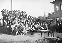 Student assembly after the fire. The ruins are behind the students; the newly-completed Technical Trades Building (right) escaped the fire.[5]