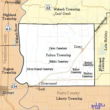 Fulton Township covers an area of 30.63 square miles (79.3 km2); 0.28 square miles (0.73 km2) (0.91 percent) of this is water. It contains two unincorporated settlements: Cates, in the eastern part of the township, and Silverwood in the southwest, just north of Lodi in Parke County. Indiana State Road 234 passes through Silverwood on its way east from Cayuga in neighboring Vermillion County.[4]