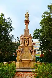 At the main entrance to the town market stands the Pelican Well; it includes a design featuring a pelican feeding its young with its own blood.
