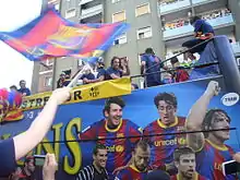 Milito (center) waves to fans during Barcelona's 2010–11 victory parade