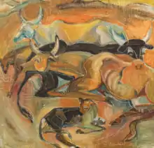 Gabrielle's primary media were watercolour and gouache, which she enjoyed because of their ability to layer colour with spontaneity and without the time constraints of oil paints. She was influenced early on by the portraiture of Augustus John. Later, Pablo Picasso's influence can be seen in Gabrielle's paintings of bulls and other animals. In her 1953 painting Cattle at Rest, Gabrielle used the sgraffito technique used in Picasso's later ceramics and paintings.[3] In 1953, art critic Tom Bolster described her work in the yearly Auckland Society of Arts exhibition as "sensitively drawn without being mawkish."[3]
