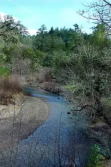 The Galbreath Preserve lies in the upper Rancheria sub-basin of the Navarro Watershed, and contains 1st, 2nd, 3rd, 4th, and 5th[4] order streams. Rancheria Creek flows northward through the Preserve and drains into the Navarro River. Rancheria Creek dries up during the summer, but its tributaries, such as Yale Creek, which lie in steep canyons, can remain wet throughout the summer. Since 1951, a USGS stream flow gage has been maintained about nine miles upstream of the mouth of the Navarro.[4] Throughout the Navarro watershed, recent alluvium, stream channel, and terrace deposits provide groundwater recharge to surface streams and supply wells and springs. Only minor amounts of groundwater are contributed by the Franciscan Formation. Flows dry up in tributaries during summer months, with the only surface water present derived from springs. Only the mainstem Navarro River, North Fork Navarro River, and lower reaches of Anderson, Rancheria, and Indian Creeks contain year-round surface water.