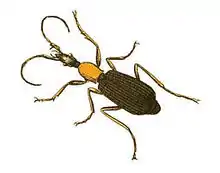 Head very long, black, with a red brown spot on the middle. Antennae dark brown, the basal joint being longest, thickest, and lightest coloured; the others are nearly of equal length; the whole being a little longer than the elytra. Neck distinct and black. Thorax light red brown, and almost oval, about the length of the head, and a little broader; it is also a little margined, and next the body truncate. Scutellum minute, black, and triangular. Elytra black, margined and furrowed, oval next the thorax, but more square at their extremities, and not covering the anus. Abdomen black. Breast light red brown; as are all the legs. The basal joints of the posterior tarsi are very long. Length of body ¾ inch (19 mm).[2]