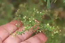 Galium porrigens can be found in many habitats from forest to coastal shrubland, and is often a member of the chaparral plant community. This is a small, woody perennial herb with climbing stems. It is covered in tiny prickly hairs which help it climb and hang. Leaves are arranged in whorls of four about the thin stems. The tiny leaves are oval-shaped, pointed, and green, often with red or purple tips and edges. The plant is dioecious, with male plants producing clusters of staminate flowers and female individuals producing solitary flowers at the leaf axils. Both types of flower are yellowish to reddish. The fruit is a berry.[3][4]