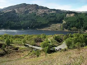 The A713 passes through Carsphairn on the Water of Deuch and St John's Town of Dalry on Water of Ken and also close to New Galloway at Kenbridge,[8] at the northern end of Loch Ken. From New Galloway the A712 passes through the hills to Newton Stewart. This road passes Clatteringshaws Reservoir, the Queen's Way,[9] Dunkitterick Cottage (the birthplace of Alexander Murray), a deer range, a wild goat park and Murray's Monument.