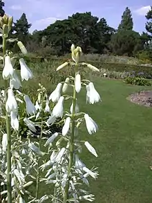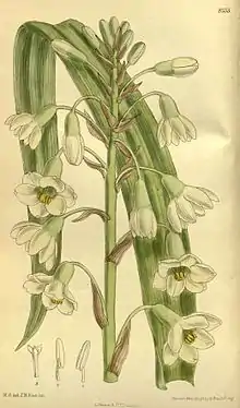 In 1955 a third species, G. viridiflora,[17] was described, followed by G. regalis in 1986.[18] For a graphical history of its circumscription, see Manning et al. 2009 Table 1.[4] and Martinez-Azorin et al. Table 2.[3] Various efforts were made during the twentieth century to dismember the Liliaceae, culminating in the separation of the higher orders, Asparagales and Liliales, and the emergence of Asparagaceae as a separate family, in which the Scilleae, including Galtonia, were now the Scilloideae subfamily. Galtonia is one of the genera in the tribe Ornithogaleae, the largest tribe within the subfamily Scilloideae.[19] Historically it was treated as part of the subfamily Ornithogaloideae of Hyacinthaceae, now obsolete terms. The preferred treatment being to consider the Hyacinthaceae as subfamily Scilloideae of Asparagaceae.[20][21] The original subfamilies within Hyacinthaceae becoming tribes of subfamily Scilloideae. Thus subfamily Ornithogaloideae became tribe Ornithogaleae.[19][3] The precise taxonomy of the Ornithogaloideae/Ornithogaleae has been problematic since at least the time of Linnaeus.[22][23][notes 2]