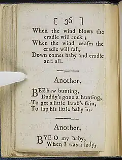 Gammer Gurton's Garland has been called one of the four foundational collections of English nursery rhymes, the others being Nancy Cock's Song-Book (1744), Tommy Thumb's Pretty Song-Book (1744), and Mother Goose's Melody (1780).[6] Ritson knew the last of these and incorporated about two-thirds of its rhymes into his own collection, sometimes in variant versions, along with many that had never been printed before.[10] Among the well-known nursery rhymes published for the first time in Ritson's original edition of Gammer Gurton's Garland are[11]