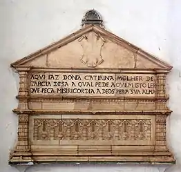 Garcia de Sá had married a local woman Catarina Pires, "the flower of Miragaia", portrayed by Camilo Castelo Branco. They had two daughters. His wife died in Goa in November 1546, and buried in a rich tomb, of white marble, in the wall of the chancel of the Church of Our Lady of the Rosary, in Goa. The following inscription is over her tomb: "Here lies Catarina, the wife of Garcia de Sá which asks for whom it read that ask mercy to God for her soul."[3][2]