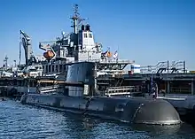 A Royal Australian Navy submarine and ship at HMAS Stirling