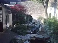 The 3,967m2 garden is divided into an eastern section of residence and a western garden section.[3] Altogether the garden has 13 pavilions, 17 tablets, and 8 stelae.[5] The Western section is composed of several pavilions around the main Lotus Pond, a rockery, and a smaller garden addition named The Garden of Sweet Grasses. The structure of the garden is formed along a north to south axis which ties the three main elements of rockery, pool, and hall together. This style of composition is also used in the Mountain Villa with Embraced Beauty. The overall design is the simplest expression of a classical garden, there is one dominant composition, the Longevity Hall, and its associated view. The 700 m2 Lotus Pond is square with two water tails to give the illusion of infinite size.[4] These tails are crossed by Fish Viewing Bridge and Ferrying Beauty Bridge The former is a three-step arched bridge adjacent to the Fry Pavilion. The latter is a natural stone bridge at the entry to the Sweet Grass Garden. The Garden of Sweet Grasses is a scaled down version of the main garden and consists of the Sweet Grass House and Bathing Gull Pond as well as a smaller rockery. This area is the herb (sweet grass) garden added by Wen Zhenheng. It is meant to evoke his principal of "to leave residents free from worries, make tenants unwilling to leave, and enable visitors to throw off their tiredness".[4] The garden is very typical of the Ming Dynasty design aesthetic because of its clear composition in plan and the elegance and simplicity of its elements.[4]