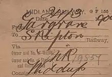 Midland Railway wagon card, for a consignment from Gargrave to Skipton, issued on 24 March 1900.