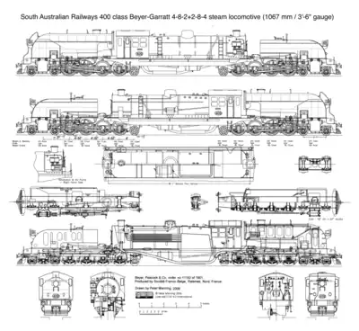 The Australian Standard Garratt was designed in 1942, for use on 3 ft 6 in (1,067 mm) gauge railways, in the critical period of World War II following the Japanese bombing of Darwin in 1942, and aerial attacks on other northern Australian centres.[55] It was a 4-8-2+2-8-4 locomotive, designed in Australia and constructed by a number of Australian railway workshops. Several design problems with the class emerged, and use of the locomotive encountered resistance from the drivers' union, especially in Queensland.[56] Most were withdrawn at the end of the war,[8] although a number continued to operate successfully in Tasmania.[57]