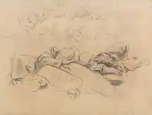 The painting was completed in March 1919, and Sargent was paid his £600 fee. It was first displayed at the Royal Academy in London in 1919.[1][9] It was voted picture of the year by the Royal Academy of Arts in 1919.[6][10] The painting was not universally liked: E. M. Forster considered it too heroic.[6] Winston Churchill praised its "brilliant genius and painful significance", but Virginia Woolf attacked its patriotism.[11] It is now held by the Imperial War Museum, along with several charcoal studies for the painting.[12] Other charcoal sketches are held by the Corcoran Gallery of Art. A small 10½ x 27¼ in. (26 x 69 cm) oil sketch, originally owned by Evan Charteris, was sold by Christie's in 2003 for £162,050 ($267,869).[5]