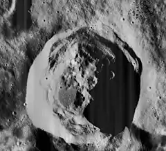 Gassendi is a large lunar impact crater feature located at the northern edge of Mare Humorum. It was named after French astronomer Pierre Gassendi.[1] The formation has been inundated by lava during the formation of the mare, so only the rim and the multiple central peaks remain above the surface. The outer rim is worn and eroded, although it retains a generally circular form. A smaller crater – Gassendi A – intrudes into the northern rim, and joins a rough uplift at the northwest part of the floor. The crater pair bear a curious resemblance to a diamond ring.