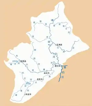 The Gaya River (Chinese: 嘎呀河; pinyin: Gāyǎ Hé) is a tributary of the Tumen River in east Jilin province of China. The source of river is located in Wangqing County and flows generally from north to south and joins Tumen River at Tumen City.The river has a length of 205.2 km and drains an area of 13,565 square km.[1]