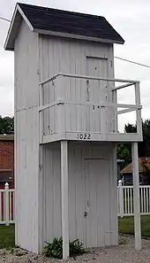 A two-story outhouse is located in the town. It was built in 1869 for apartments that were attached to a general store. The top floor was used by the apartment dwellers while the bottom floor was used by patrons of the store. Although the store and apartments were demolished, the outhouse remained. Each level has two seats, so the outhouse could be used by four at a time. Waste from the top level dropped behind a false wall into a pit.[7] It is located at the corner of N Pine Street and Front Street. 39°27′32″N 88°29′44″W / 39.45889°N 88.49553°W / 39.45889; -88.49553 (Two-story outhouse)