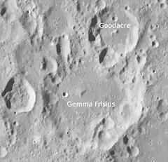 Gemma Frisius is a lunar impact crater that is located in the rugged southern highlands of the Moon. It was named after Dutch physician Gemma Frisius.[1] It lies to the north of the walled plain Maurolycus, and southeast of the smaller crater Poisson. The crater Goodacre is attached to the northeast rim.