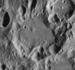 The southeastern rim of the crater is also worn, and the inner wall has slumped nearly a third of the distance across the interior floor. The remainder of the floor is relatively level and deep, with a central peak that is offset to the northwest of the midpoint.
