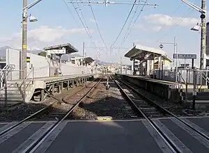 Gendōji Station has two opposed ground-level island platforms serving two tracks connected by a level crossing at the end of the platforms. The station building has automated ticket machines, automated turnstiles and is unattended.