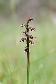 Genoplesium nudum, commonly known as the tiny midge orchid in Australia or the red midge orchid in New Zealand, is a small terrestrial orchid native to south-eastern Australia and New Zealand. It has a single thin leaf fused to the flowering stem and up to forty small, reddish-purple or green and red flowers. Australian and New Zealand authorities use the name Corunastylis nuda[2][3][4] but Genoplesium nudum[1] and Prasophyllum transversum[5] are used by the World Checklist of Selected Plant Families.