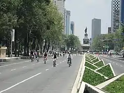 The implementation of green spaces into urban projects like public parks, roof gardens, protected areas, vegetation in public infrastructure or even private gardens help clean the air, improve human wellbeing, reduce noise, increase the attractiveness of crammed communities and foster interaction across social groups. Compact developments with an emphasized verticality are another approach to creating active spaces with efficient energy use, less driving distances, reduced emergency response time, mixture of homes, services and jobs.[41] Respected urbanists such as Jeff Speck argue for the walkability of cities as a solution for sustainable cities that work to stop climate change, foster community engagement, create local diversity and self-sufficiency with attainable housing, schools, parks and services that are demand induced and interconnected.[42] Other suggestions of urbanism are to adapt to the already concentrated peripheries by decentralizing jobs and amenities, by creating new points of interest.[43][44] Recent projects to incorporate sustainability can be seen in Santa Fe with the creation of La Mexicana Park, renovations to sections of the Chapultepec public park, green infrastructure in main roads such as Periferico and Reforma and the adoption of the Bando 2 policy that restricted urban growth through strict permits and housing loans by INFONAVIT (the national housing institute of workers).[43][40] The definition of cultural corridors like Regina St where diverse groups coexist in a mixture of residential and commercial developments is also a good example.[45]