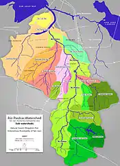 Puerto Rico has lakes (none of them natural)[4] and more than 50 rivers. Most of these rivers are born in the Cordillera Central, Puerto Rico's principal mountain range located across the center of the island. The rivers in the north of the island are bigger and with higher flow capacity than those of the south. The south is thus drier and hotter than the north. These rivers make up 60 watersheds throughout the island, where over 95% of the runoff goes back to sea.