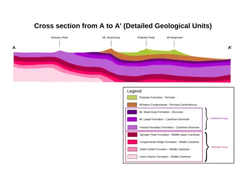 The Permian-Carboniferous Whiteout Conglomerate and the Permian Polarstar Formation make up the upper part of the 13-km thick geologic series of rock strata.[1]