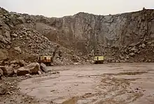 Much of the crushed rock aggregate in the area comes from various layers in the Carboniferous limestone. Higher specification aggregates, such as those required for road surfacing, however, come mainly from sandstones and igneous rocks, both volcanic (BVG) and intrusive (various granitic bodies).[32] Two quarries at Roan Edge (east of Kendal) and Holmscales are currently producing high specification roadstone from sandstone. The single quarry producing very high specification aggregate is at Ghyll Scaur, just north of Millom, which is the only currently available source for this quality of roadstone in England. It works a welded rhyolitic tuff from the Waberthwaite Tuff Formation of the BVG.[33]