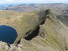 Glacial landforms, the arête Striding Edge and a cirque filled by Red Tarn