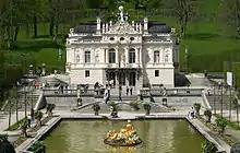 From 1868 Ludwig II commissioned a project for a new Versailles Palace in Linderhof Valley. From December 1868 till September 1873, Dollmann presented seventeen different floor plans and numerous front elevations as well as many drawings of the bedroom. In 1873 the project was transferred to the Herreninsel in Chiemsee. As Herrenchiemsee Palace it remains uncompleted.