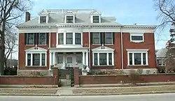 The house is a 2½-story, brick Georgian Revival structure. It features a symmetrical facade and a hipped roof with three gable dormers. The symmetry, however, was undone by the addition built onto the northeast side. It was designed by local architect Bruce McKay and Grant Wood. Wood is thought to have designed the bay window for the first-floor chapel.[3] Other additions were built onto the back of the structure. The house was listed on the National Register of Historic Places in 1982.[1]