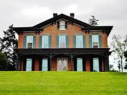 The house is considered to be the best example of Italianate architecture in Fort Madison.[2] The 2½-story, brick house sits on a bluff overlooking the city and the Mississippi River below. The rectangular main block is almost square, and it has a smaller, two-story wing in the back. It is capped with a hipped roof that is pierced by four symmetrically spaced interior brick chimneys with corbelled caps. The cornice that surrounds the house features elaborately carved, paired wooden brackets and dentils under the eaves. At the top of the main facade is a triangular pediment with a single round arch window. There is a flat area on top of the roof that suggests a widow's walk, but there is no evidence that it was ever built.[2]