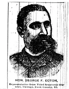 George French Ecton (c. 1846 – September 19, 1929) was a civil rights activist and the second African American state legislator in Illinois. He was born a slave in Winchester, Kentucky, in about 1846 to Antonio Ecton and Martha George. In June 1865, after the American Civil War and the abolition of slavery, George and a friend received free papers in the mail and set off to escape slavery, as they were still being held in bondage. When they arrived in Cincinnati, Ohio, they were hired as deck hands on the steam packet Sherman, working a route between Cincinnati and Wheeling, West Virginia. Later, in Cincinnati, George worked at hotels, including the Broadway House, Walnut Street House, Burnett House, and Spencer House. He became ill with smallpox while at the Walnut Street House, but recovered. He also began to attend night school taught by Luella Brown.[1] He was reported to be a college graduate.[2]