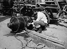 Following the capture of Bremen, Germany, in April, Gosse led Naval Party 1571 to the port to clear mines laid by the retreating Germans in the Überseehafen.[1][9] Prior to being sent forward to Bremen, Gosse had interrogated a German prisoner of war (POW) who had been involved in the demolition of the Überseehafen and its facilities who described a mine known as an "Oyster", which was "impossible to sweep for and could never be rendered safe".[10] After arriving in Bremen, Gosse risked his life many times in defusing mines. When his divers reported a sighting of what appeared to be a new form of mine, on 8 May Gosse dived himself and verified that it was a "D-type mine with additional fittings", the "Oyster" mine described by the German POW. This mine was pressure-operated, and its detonation train included magnetic and acoustic elements. About 18:00 the next day, Gosse examined the mine by touch, as the visibility was so poor that his waterproof torch was of no use. In order to maintain his depth, he had to tether himself to the mine marker buoy rope. Using tools he had improvised, Gosse interrupted the detonation train by removing the primer release and the primer, which had to be extracted from about 18 inches (460 mm) down a 2-inch (51 mm) wide tube. Having made the mine safe, Gosse was releasing his tether when there was a small explosion. Later examination of the mine showed that water had entered the primer tube and actuated a water pressure trigger set to fire the detonator if the mine was raised. Gosse personally defused two more "Oyster" mines at Bremen between 9 and 19 May,[1][9] and in both cases, the detonator fired before the mine reached the surface.[4] Another officer from Naval Party 1571 said later that "if Gosse hadn't found an answer to the ["Oyster"], Bremen Harbour would have been unusable".[11]